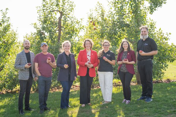 Brunau Côté, président de l’Association des emballeurs de pommes du Québec; Sébastien Morissette, vice-président Les Producteurs de pommes du Québec; Audrey Bogemans, députée d’Iberville; Elise Boyer, directrice générale de Fondation Olo; Isabelle Robert, copropriétaire du Vignoble Coteau Rougemont (hôte); Hélène Chabot, cheffe des services intégrés en périnatalité et pour la petite enfance au CISSS de la Montérégie-Centre; Jérôme-Antoine Brunelle, directeur général des Producteurs de pommes du Québec.
